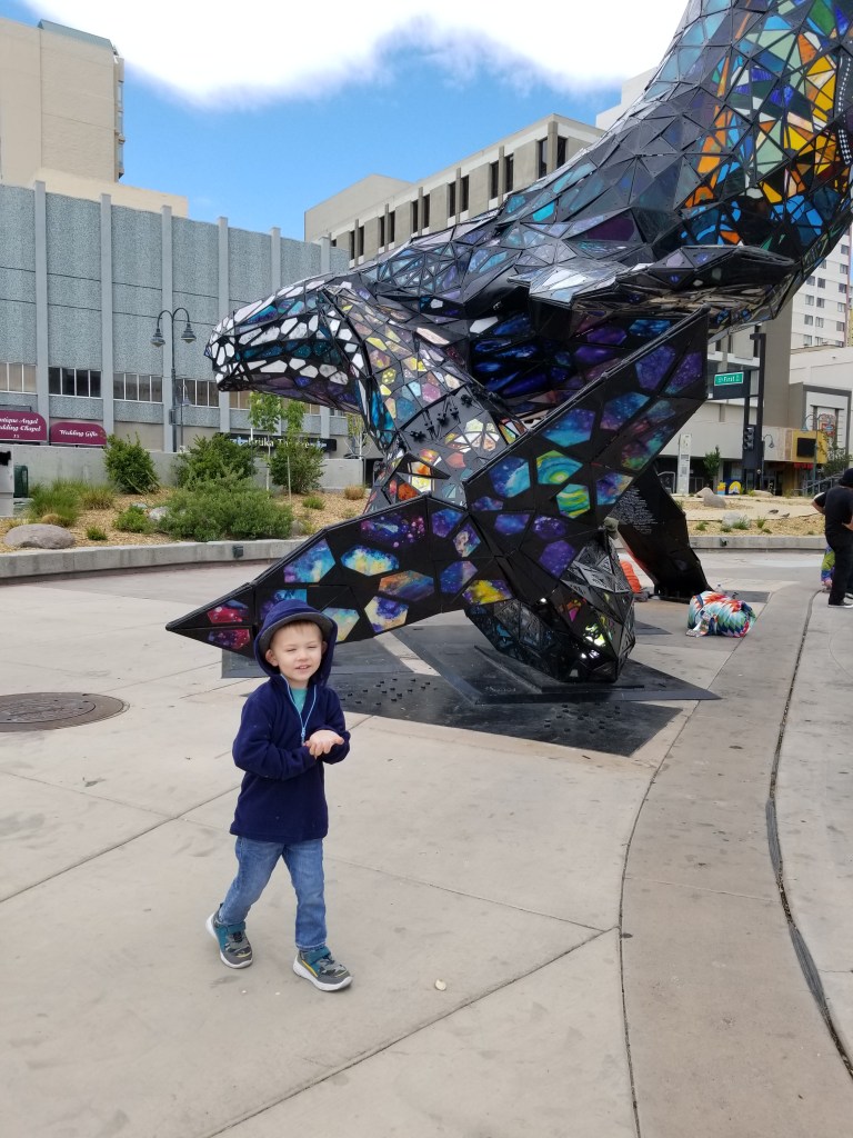 We stopped in Reno and walked around a bit. Baruch, who was very eager to get to our destination, threw a huge fit about it. He was somewhat soothed by the scones that we split, though. (We like to eat, if you hadn’t noticed…)