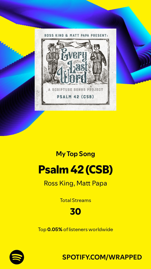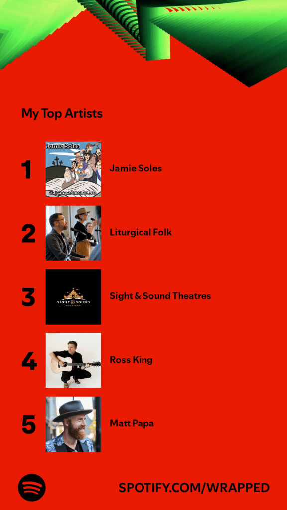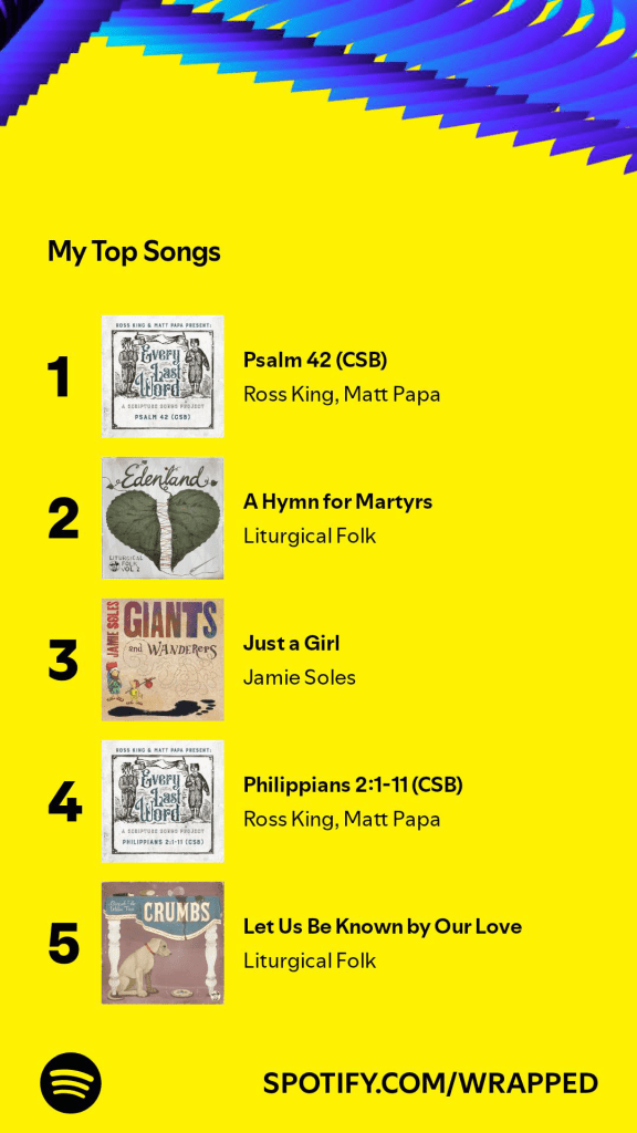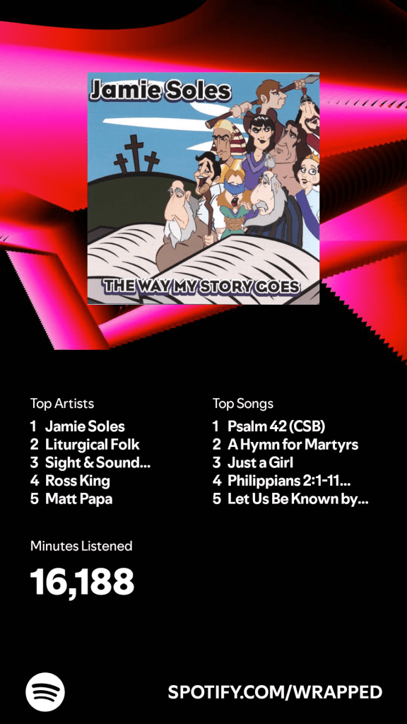 I was a bit surprised that my top artist was Jamie Soles, but I shouldn’t be as I listened to his albums almost non-stop at the beginning of the year. I was homesick for Pennsylvania (where we lived for a few years when I was a little kid). Jamie Soles was our favorite artist and we knew all of his songs by heart. They’re fun, they sing scripture, and they’re beautiful. ❤