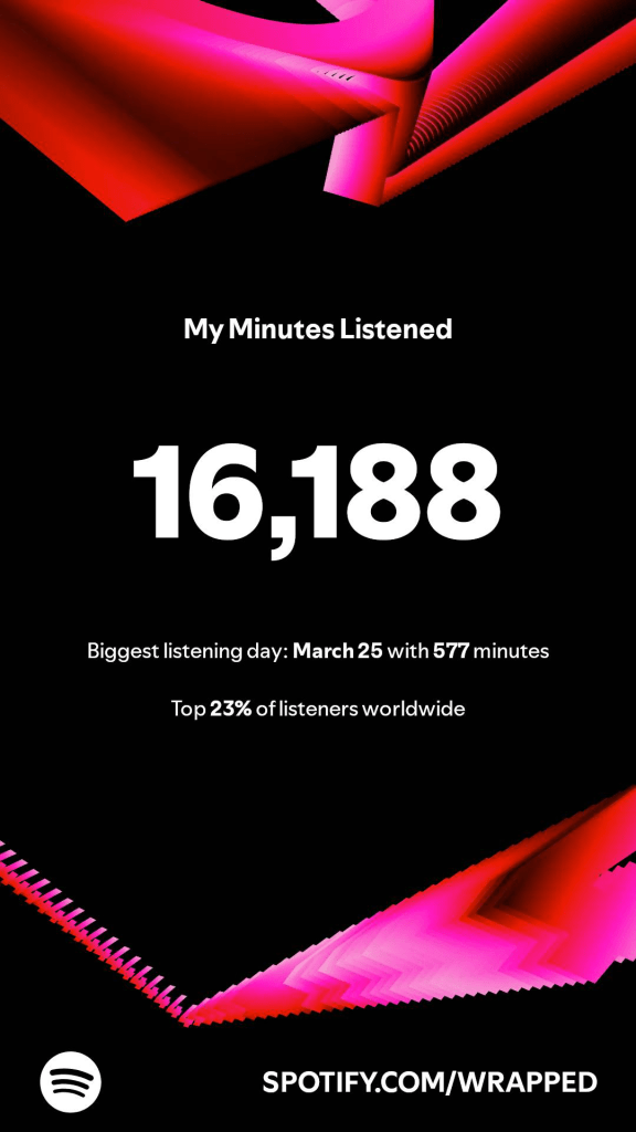 Hey all! I was once again surprised by my Spotify wrapped. I thought I’d listened to more music this year than last, so I was shocked to see that I actually listened to 3,000 minutes less. Very little of it was me just sitting and listening. For the most part, I had the songs on for background music when I was writing or working.